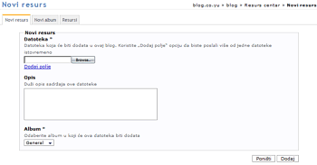 Ovde možete dodati novi resurs (fajl) u Vaše resurse. Klikom na dugme iza polja Datoteka otvoriće Vam se prozor u kome možete odabrati željeni fajl sa Vešeg diska. Kada odaberete željeni fajl i ukucate opis resursa, potrebno je odabrati album u koji će željeni fajl biti smešten. Klikom na opciju Dodaj šaljete željeni fajl u Vaše resurse na blogu, odakle ga posle možete upotrebiti u Vašim člancima.