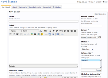 Odabirom ove opcije počinjete sa pisanjem novog članak za objavljivanje na Vašem blogu. Prvi put je potrebno sačekati malo duže dok se učita tekst editor za pisanje članaka. Polja označena sa zvezdicom (*) su obavezna i predstavljaju minimum koji se mora popuniti da bi članak bio uspešno objavljen. Pisanje članka počinje sa navođenjem teme članka u polju Tema. Zatim ukucajte željeni tekst u tekst editor (polje Tekst). Ako imate dugačak tekst i ne želite da bude odmah ceo vidljiv na Vašem blogu, možete iskoristiti polje Prošireni tekst. U tom slučaju u polje Prošireni tekst kucate opširniji tekst, dok u polje Tekst kucate samo početak članka ili kraću verziju članka. U ovoj varijanti na Vašem blogu se prvo pojavljuje kraći tekst na čijem kraju stoji link Dalje, na koji kada se klikne dobijate kompletan tekst.